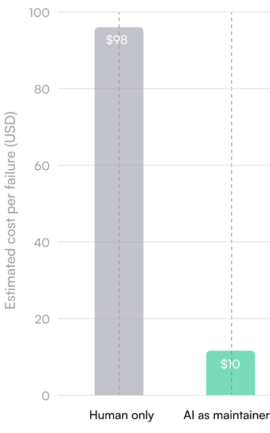 When you weight these by frequency and add overhead for context switching, CI wait times, and occasional misdiagnosis, the realistic all-in time per failure for human-only maintenance is approximately 1.3 hours.
