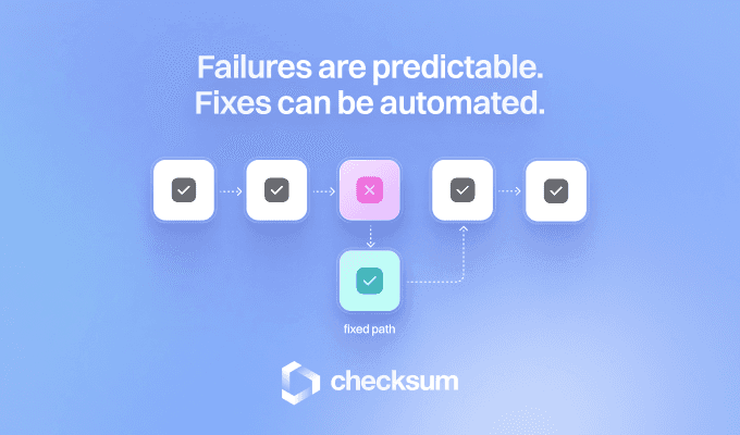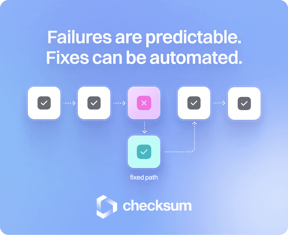 Beyond faster fixes, Checksum reduces the failure rate itself. From our data, AI-maintained suites see median failure rates of 2.7 per 100 runs versus 14.8 for manual maintenance—an 82% reduction.
